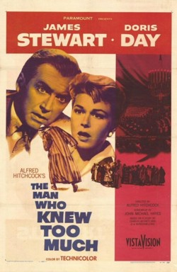 For their second film together Hitchcock chose to return to the scene of an earlier crime, his 1934 British production THE MAN WHO KNEW TOO MUCH. Although Hitchcock liked his earlier effort, he regarded it as "the work of a talented amateur." Now, with the considerable resources of Paramount Pictures behind him, Hitch would remake the film as a master craftsman at the top of his game. The 1956 remake of THE MAN WHO KNEW TOO MUCH is superior to the original in almost every aspect. The cinematography by Robert Burks is stunning, Richard Mueller's use of Technicolor is spectacular, while George Tomasini's editing is disturbingly subtle. The story line of the remake is fairly faithful to that of the original, including the explosive finale in which an attempted assassination is thwarted to the musical accompaniment of Arthur Benjamin's lavish "Storm Cloud"cantata. For the new sequence, shooting would be completed on location in London at the Royal Albert Hall, complete with the London Symphony Orchestra, and the Covent Garden Chorus.