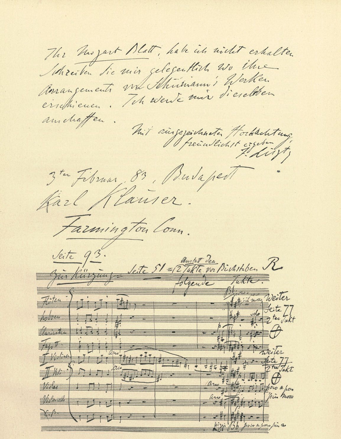 Visually, the original musical manuscript in the composer's own notehand that we call an autograph score can assume almost a life of its own. It has more "life" than a printed or engraved edition, for reasons very obvious: it's literally a graphic picture of what the composer wrote and is therefore unsullied by editorial liberties or, usually, errors. An autograph score is usually the best source, and is always particularly useful, for establishing an authentic text of a printed edition of the work in question -- certainly as the composer intended it at the time of its completion. A composer's own changes or revisions in the autograph score can also provide insights into the compositional process, the development of a composer's style, and may even indicate how he wanted his music performed. They can also shed light on the order in which the same composer penned different works.