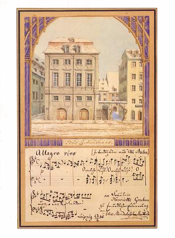 Felix Mendelssohn's facility as a composer was matched by his skills as a painter. His famous watercolor of the old Gewandhaus, the principal concert hall in Leipzig, bears in his own notehand a quotation of music from "Ali Baba" by Luigi Cherubini. The inscription reads, "To Fraulein Henriette Grabau, in friendliest remembrance, Felix Mendelssohn Bartholdy, Leipzig, 23 Feb. 1836." Coincidental history shows us that Mendelssohn so personalized his painting on the very date the 13-day siege of the Alamo began in what was then the northern Mexican province of Coahuila y Tejas, in the town of San Antonio de Bexar.