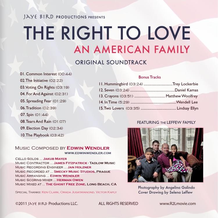 Edwin Wendler's score is light and understated, but in a strange way it asks questions and elicits consideration. If you like your music to be thought-provoking and introspective then this is a wonderful score, and a perfect accompaniment to a documentary dealing with a subject that many find controversial. You can hear music samples from the soundtrack on the composer's site at The Right to Love: An American Family where you can also purchase the album. Proceeds will help the Leffew family attend upcoming screenings of the documentary. The official movie website is at www.r2lmovie.com including trailer and more details about the film. The film has not been released theatrically but it is finding an audience on the festival circuit. It is also available on DVD and you can apply to host screenings. See for yourself the Leffew family's video channel called "Gay Family Values" at www.youtube.com/depfox.